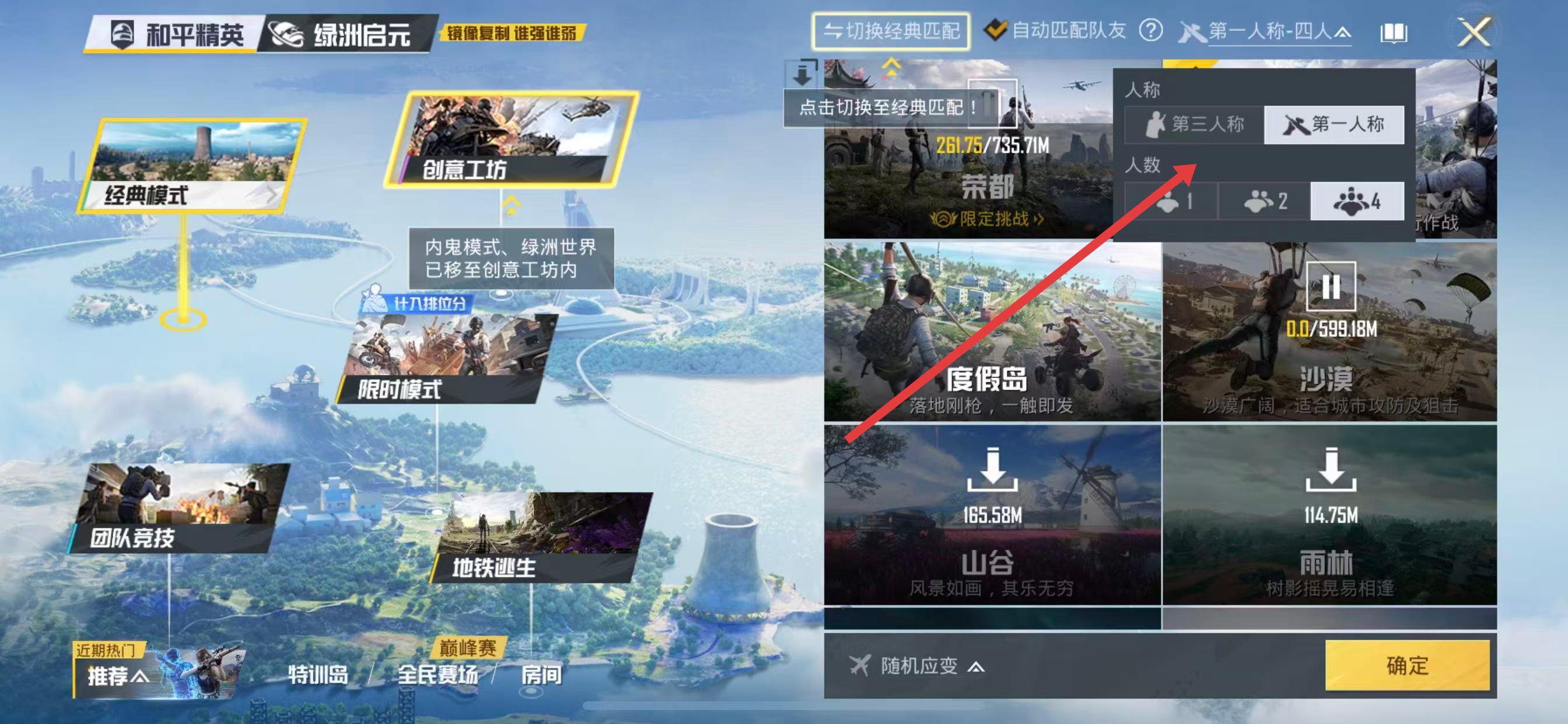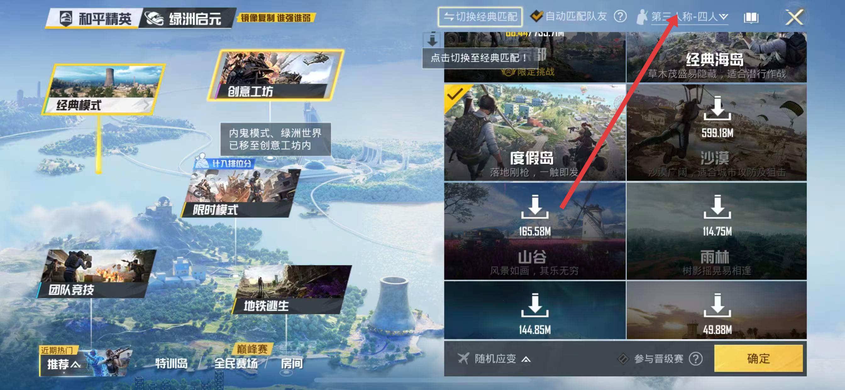 2、在進入的模式選擇界面中,點擊界面右上方的第三人稱-四人區(qū)域。