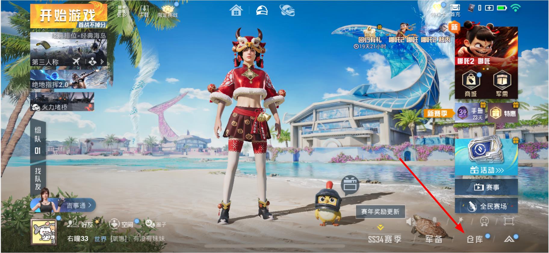 1、打開絕地求生游戲進入主界面,點擊界面下方的倉庫選項。