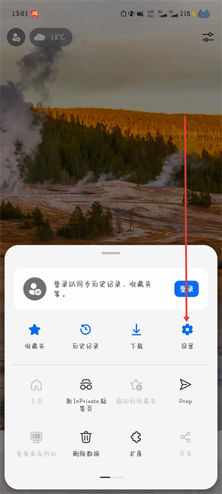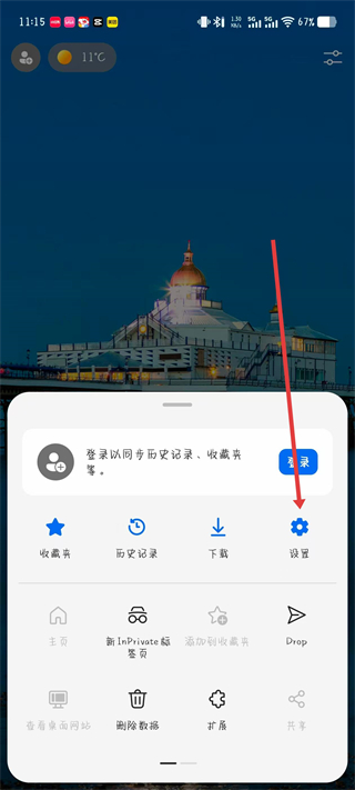 2、在功能面板中,找到設(shè)置選項(xiàng)并點(diǎn)擊,進(jìn)入瀏覽器的設(shè)置界面。