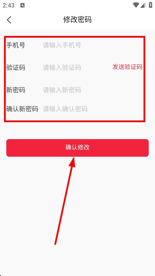 4、在修改密碼頁面,輸入手機號并點擊發(fā)送驗證碼,輸入收到的驗證碼,再設(shè)置新密碼并確認(rèn)新密碼,最后點擊確認(rèn)修改即可完成登錄密碼修改。