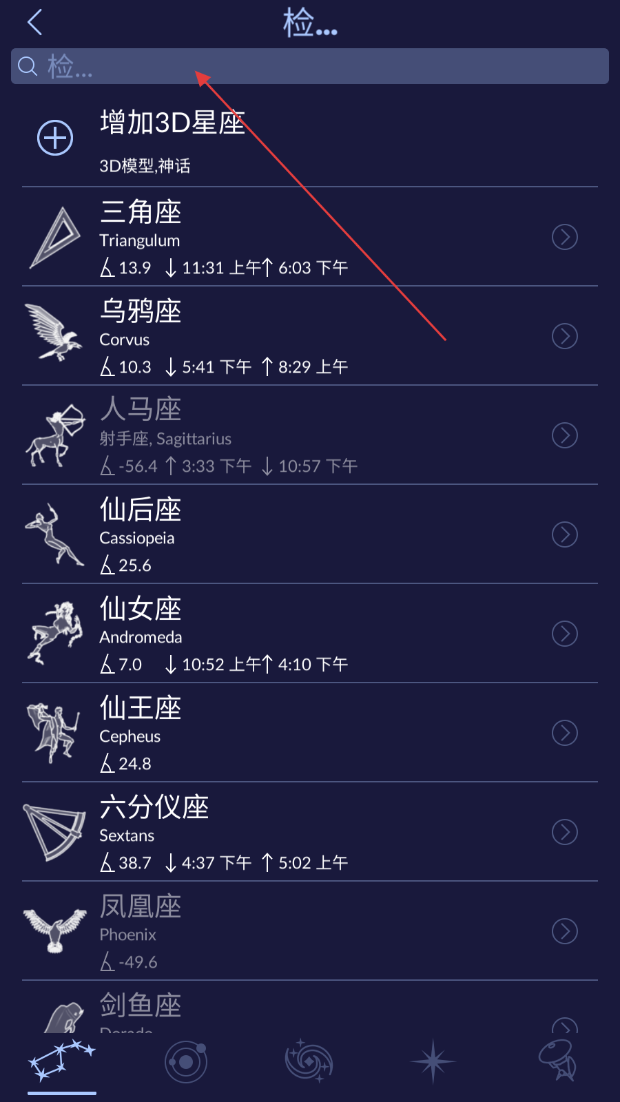 3、在搜索結果列表中,點擊目標星座對應的條目,應用會自動定位到該星座在星空中的位置并展示詳細信息。