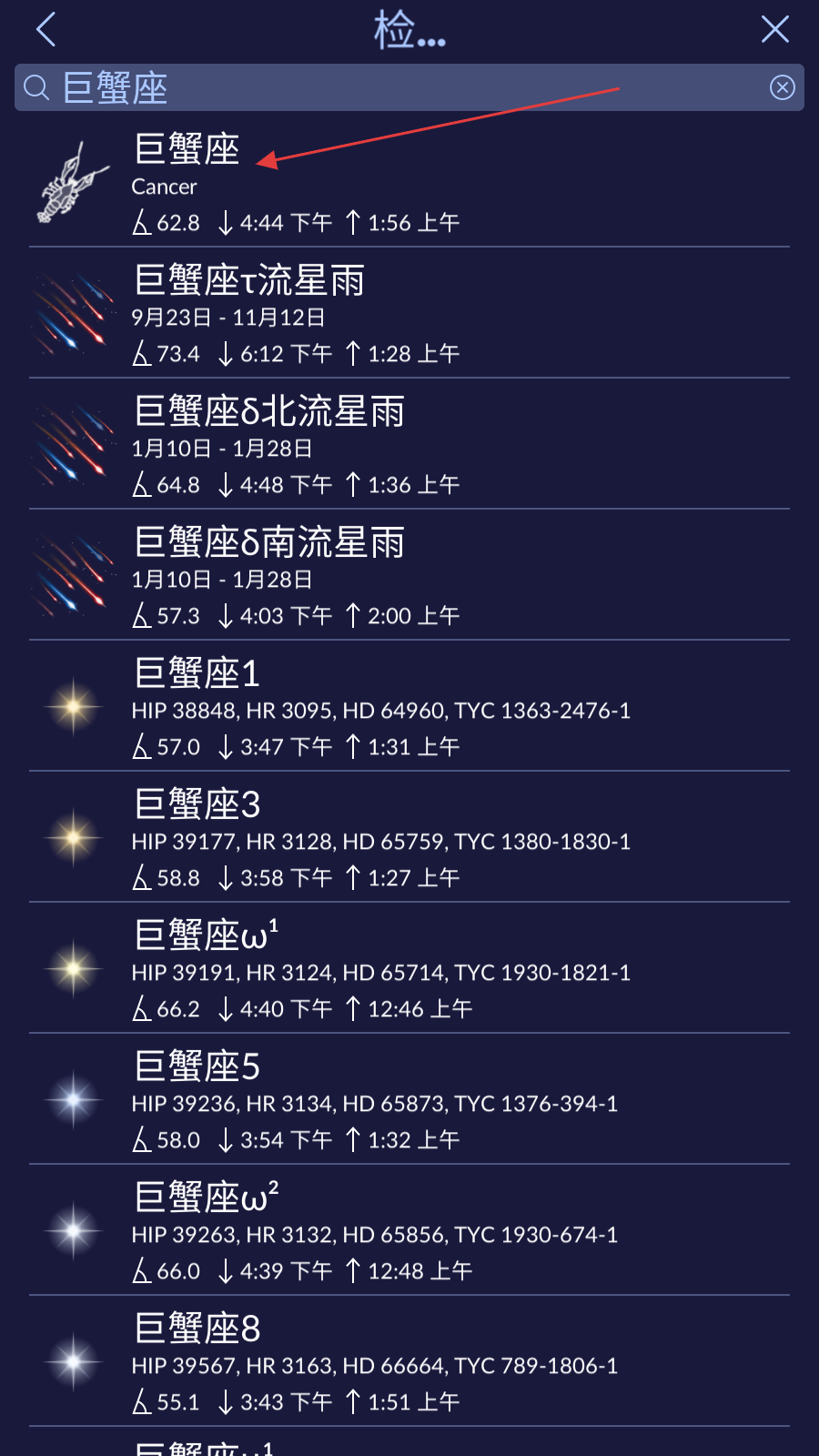 2、在搜索頁面頂部的搜索欄中輸入要查找的星座名稱,比如巨蟹座,輸入過程中頁面會實時顯示相關的星座及天體條目。