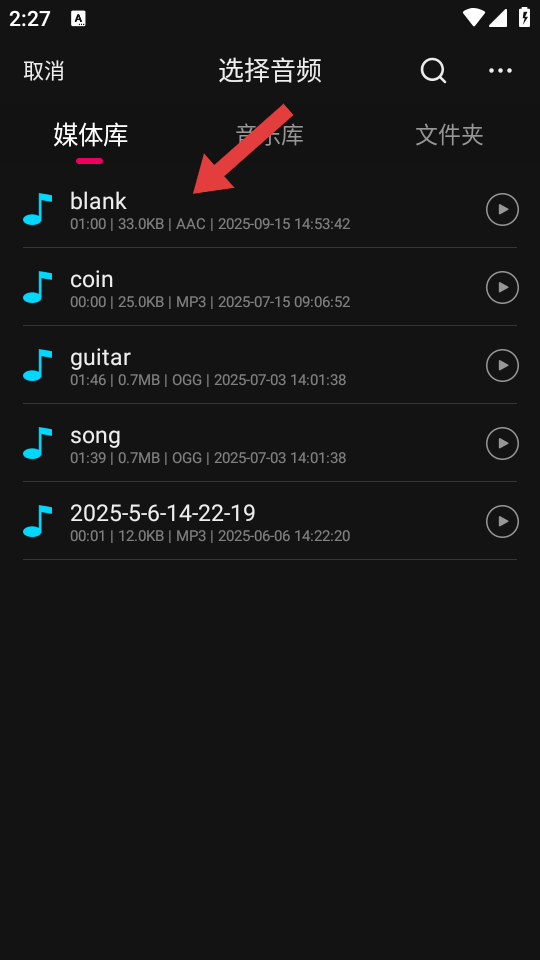 2、在音頻選擇界面,點(diǎn)擊選擇要剪輯的音頻如媒體庫中的blank音頻。