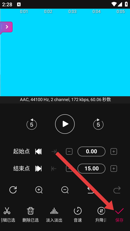 3、進(jìn)入音頻剪輯界面后,設(shè)置起始點(diǎn)等剪輯參數(shù),完成后點(diǎn)擊右下角保存。