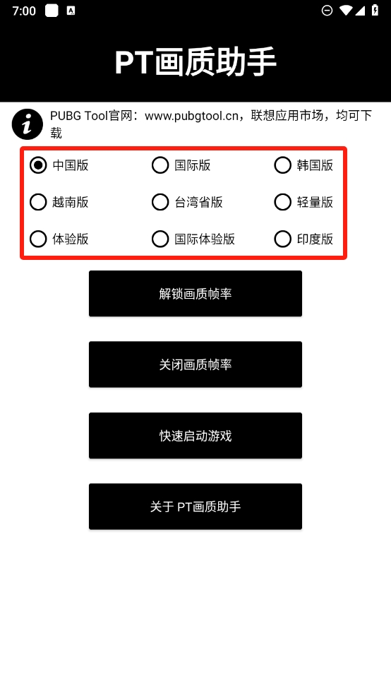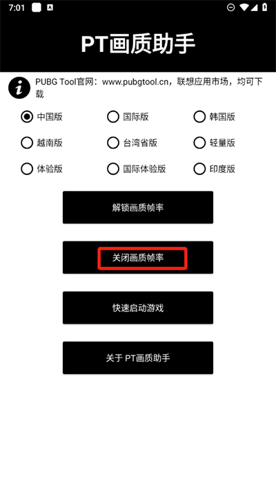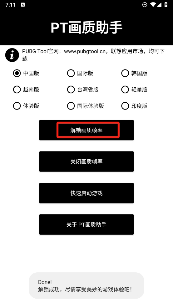 2、手機(jī)中有和平精英的游戲后才能解鎖畫質(zhì),選擇當(dāng)前游戲的版本后直接點(diǎn)擊解鎖畫質(zhì)即可解鎖高清畫質(zhì)(注意使用該軟件時(shí)一定要先啟動(dòng)游戲后才能解鎖畫質(zhì));