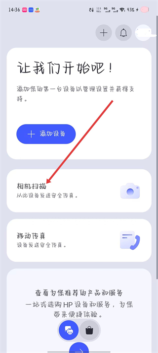 1、打開惠普云打印應(yīng)用,在首頁點(diǎn)擊相機(jī)掃描選項(xiàng),進(jìn)入相機(jī)掃描相關(guān)頁面。
