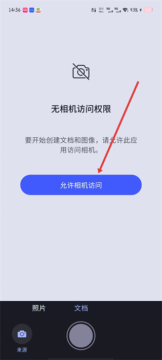 2、頁面提示無相機(jī)訪問權(quán)限,點(diǎn)擊允許相機(jī)訪問按鈕,授予應(yīng)用相機(jī)權(quán)限。