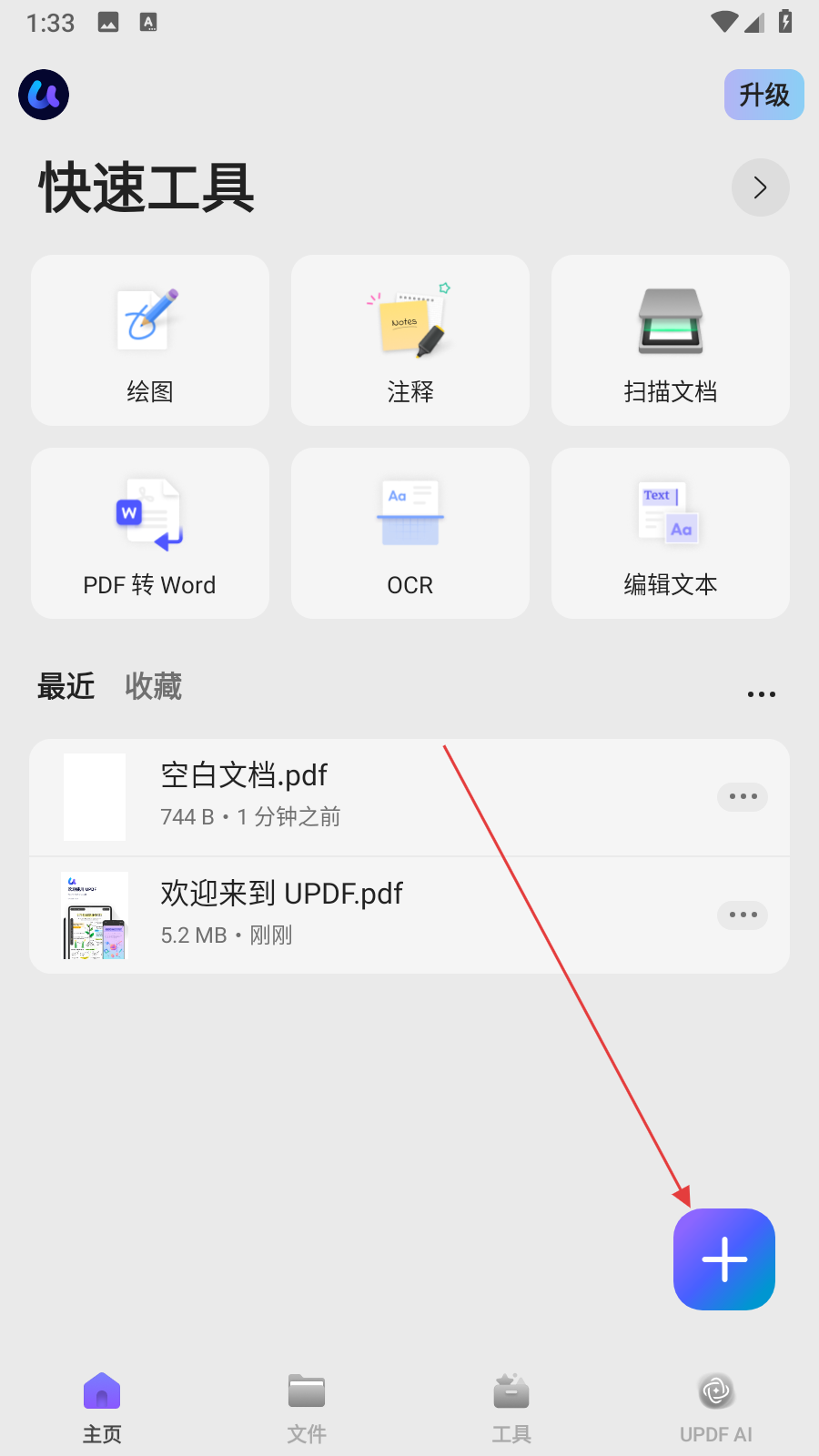 1、打開UPDF應(yīng)用,點擊界面右下角帶有+標識的按鈕。