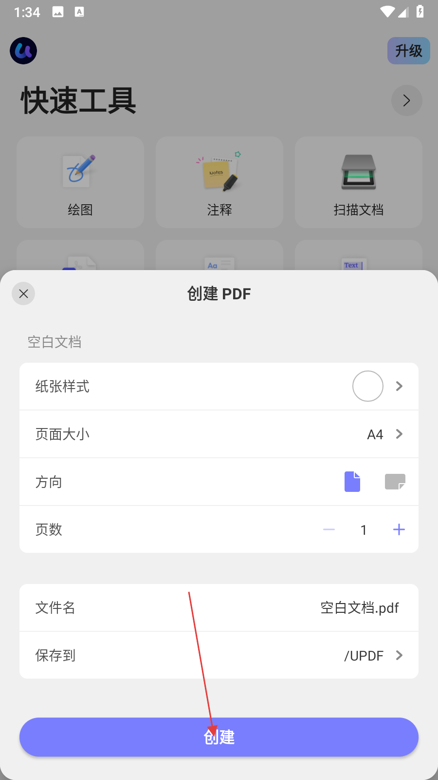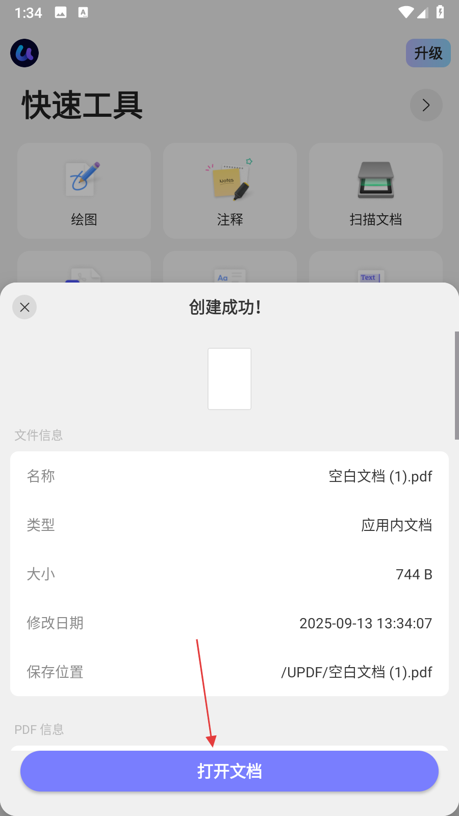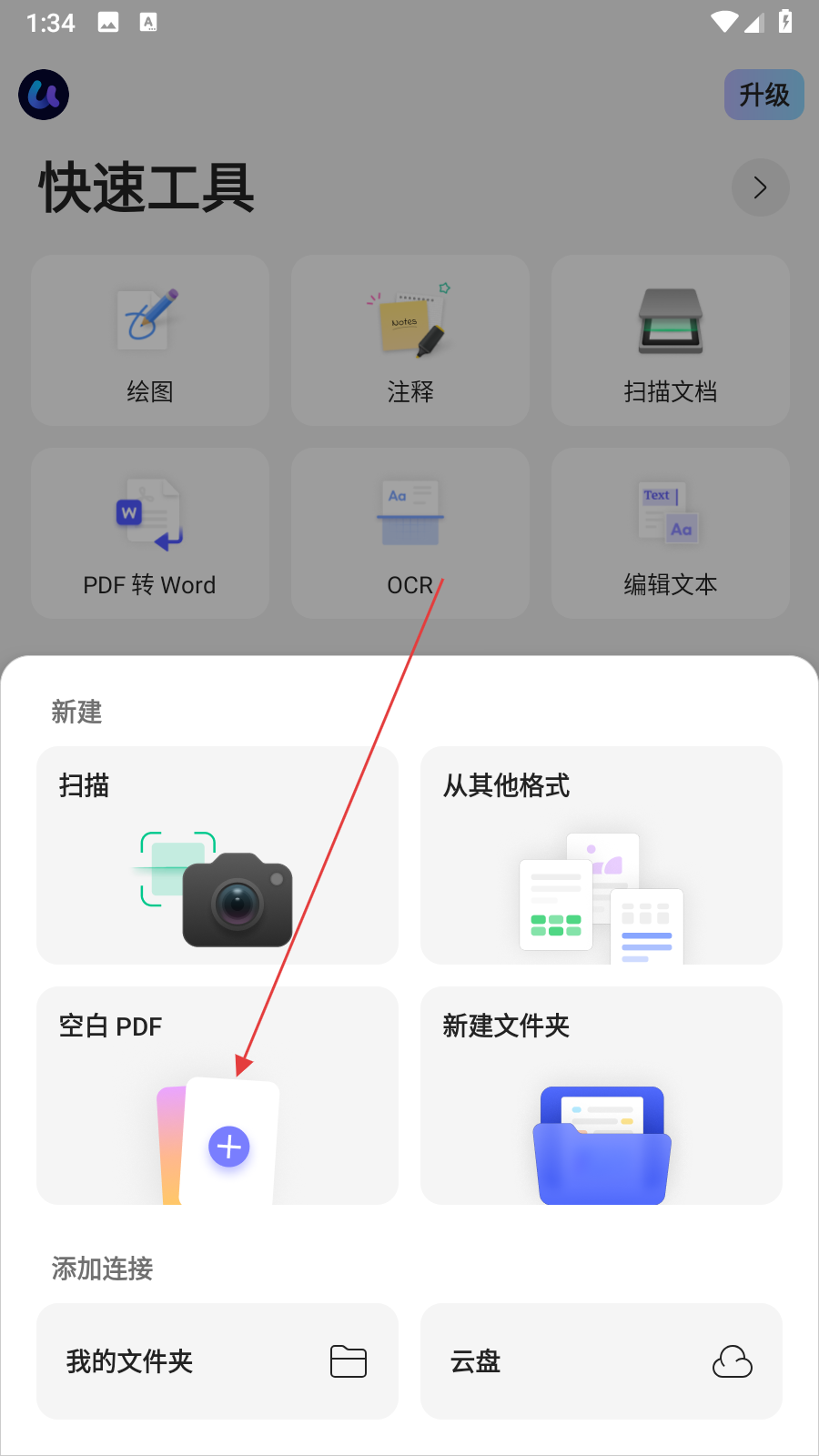 2、在彈出的菜單中,點擊空白PDF選項,進入創(chuàng)建PDF的設(shè)置界面。