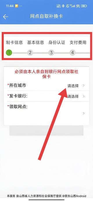 3、在網(wǎng)點(diǎn)自取補(bǔ)換卡頁(yè)面,依次選擇所在城市、發(fā)卡銀行及領(lǐng)取網(wǎng)點(diǎn),按流程完成社保卡補(bǔ)換的信息提交。
