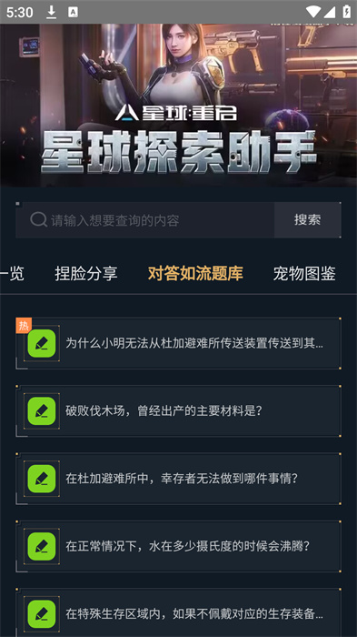 1、軟件中分為四個欄目,分別是武器庫、捏臉數據、答題庫、寵物圖鑒,在的對應的頻道可以看到不同的內容;