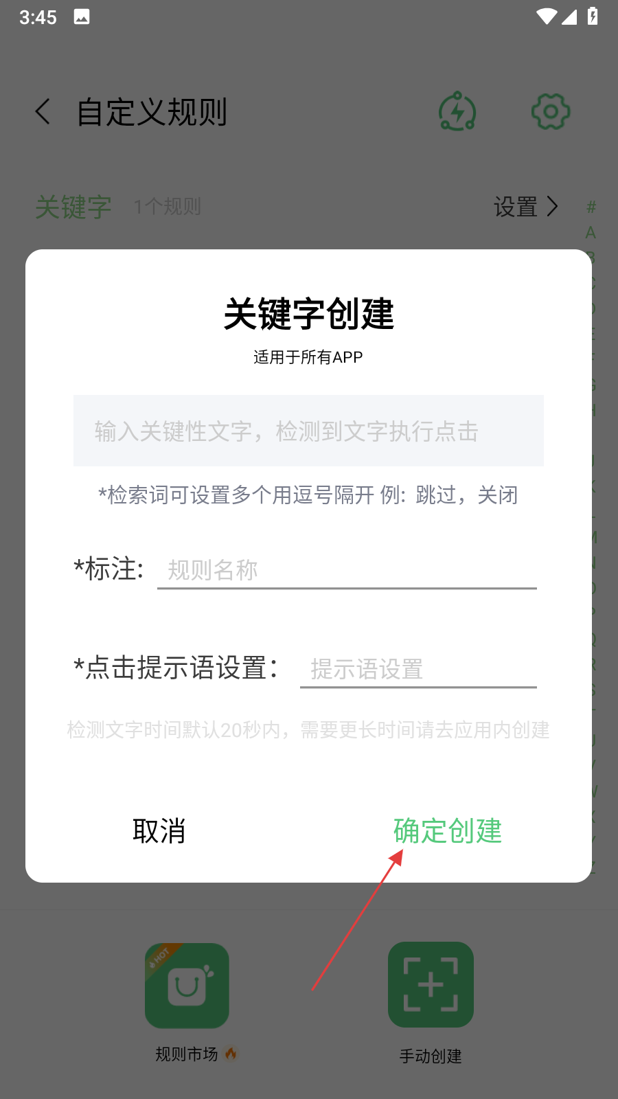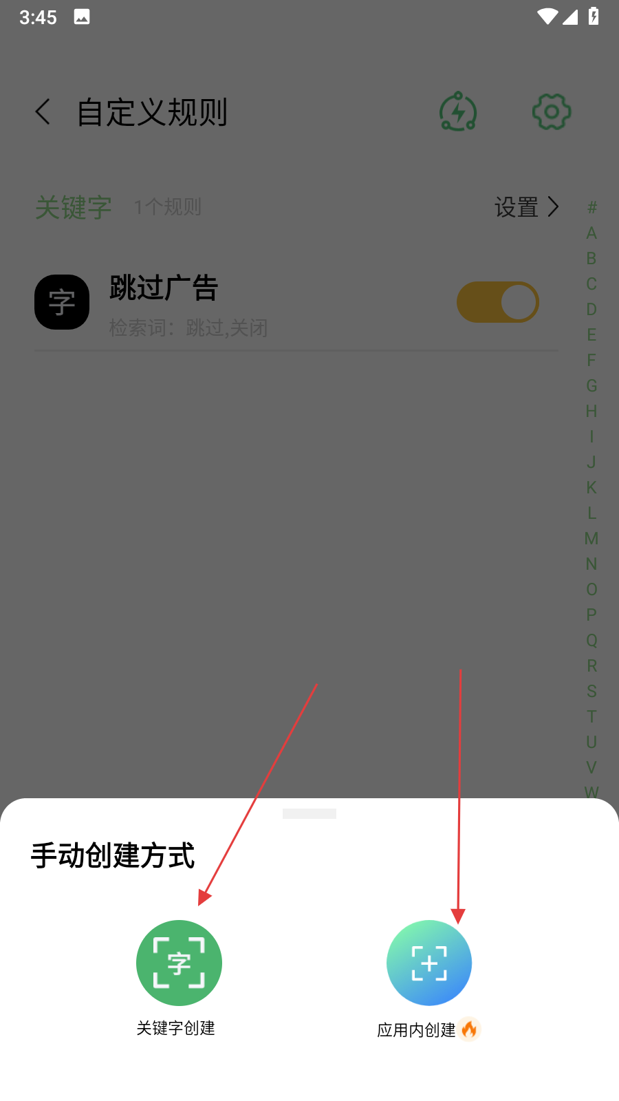 1、打開綠去廣告App進入自定義規(guī)則界面,點擊手動創(chuàng)建按鈕,會彈出手動創(chuàng)建方式彈窗,里面有關(guān)鍵字創(chuàng)建和應(yīng)用內(nèi)創(chuàng)建兩種選擇。