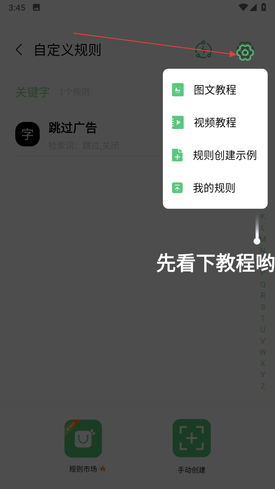 3、選擇應(yīng)用內(nèi)創(chuàng)建,點擊自定義規(guī)則界面右上角的齒輪圖標(biāo),在彈出菜單中選擇,了解更多手動創(chuàng)建規(guī)則的細節(jié)和技巧。