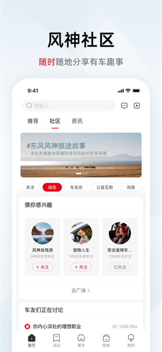 東風風神app是一款有著更加專業(yè)的車輛最新信息的軟件,可以提前了解東風車輛最新款的車輛信息,并且還能線上撥打店面的電話進行資訊和了解,直接預約試駕的信息,這樣才能給用戶全面的介紹一下車輛當前的最新的高科技,其中還能掌握最新的帖子資訊,一起線上溝通一下當前東風車輛的使用感受,有任何使用方面的問題還能直接和廠家客服聯(lián)系,實時參與最新的廠家活動,還能獲取到免費的獎品。