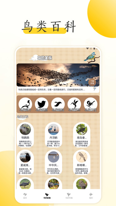 a、鳥類百科知識,用戶了解各類鳥類的特點、習(xí)性等,增加鳥類知識的儲備;