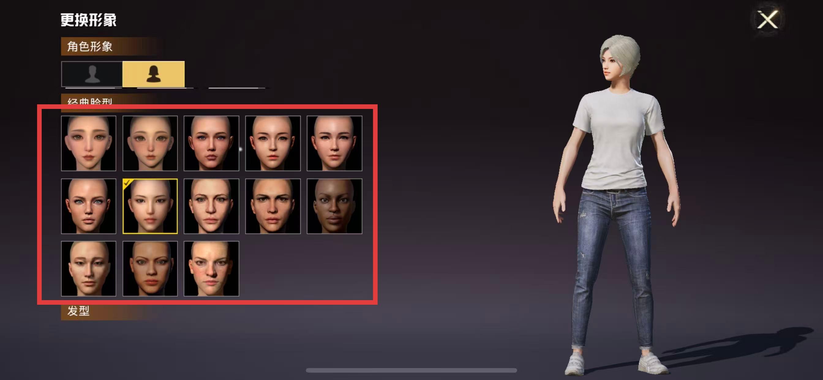 3、在角色形象的經(jīng)典臉型區(qū)域,選擇帶有不同膚色的臉型,即可完成膚色顏色的更換。