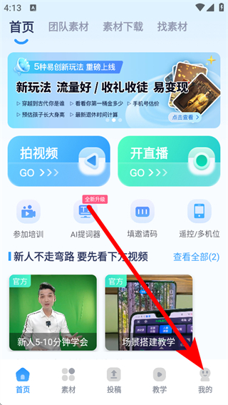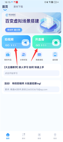 1、首先下載安裝好易創(chuàng)相機APP,點擊進入軟件,首頁主要是就那些拍視頻開直播,提供各種虛擬場景的搭建,點擊”我的作品“即可查看自己發(fā)布的所有視頻;