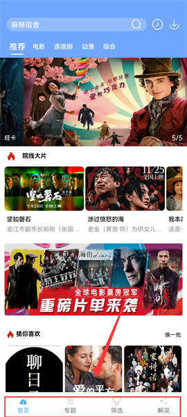 1、通過本站下載安裝好軟件后,點(diǎn)擊進(jìn)入軟件,在軟件的首頁可以看見有專題/篩選/解說等欄目,首頁有這種豐富的影視劇資源,電影、電視劇、動(dòng)漫都能找到,用戶可以直接在搜索欄輸入目標(biāo)名字進(jìn)行搜索;