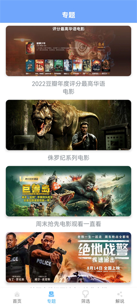 2、在專題欄目,可以看見各種不同專題的影視,例如侏羅紀(jì)系列電影、年度評分最高華語電影等不同的專題,方便大家查找自己喜歡的資源;