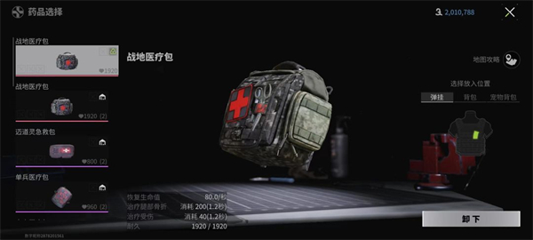 當(dāng)然,道具的必選項還有醫(yī)藥包,如果你喜歡剛槍,那么建議帶上戰(zhàn)地醫(yī)療包,其回復(fù)量足夠支撐各位持續(xù)多場戰(zhàn)斗。在對局中使用醫(yī)療包之前,一定要注意確認周圍環(huán)境足夠安全后,躲在掩體后治療,否則治療期間既不能移動也不能開槍,被人發(fā)現(xiàn)就是活靶子非常危險。