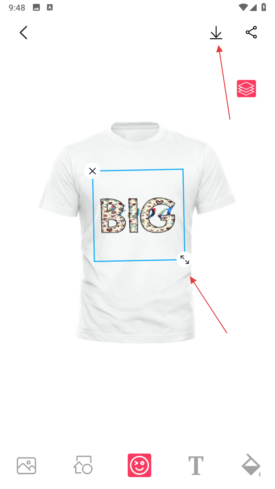 4、貼紙?zhí)砑拥絋恤后,可通過調整框調整貼紙的大小和位置,調整完成后,點擊頁面右上角的下載按鈕,保存設計好的T恤作品。