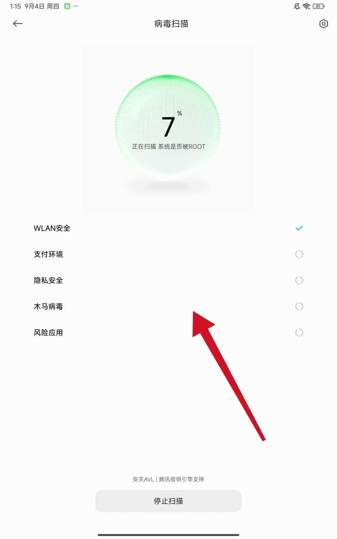 2、進(jìn)入病毒掃描頁(yè)面后,手機(jī)開(kāi)始自動(dòng)掃描WLAN安全、隱私安全等項(xiàng)目。