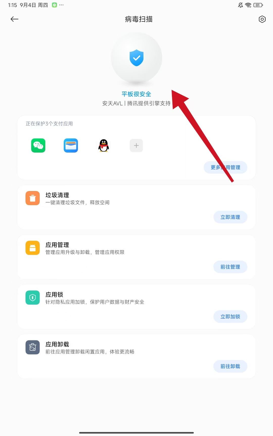 3、等待掃描完成,若顯示平板很安全,則表示未檢測(cè)到病毒威脅。