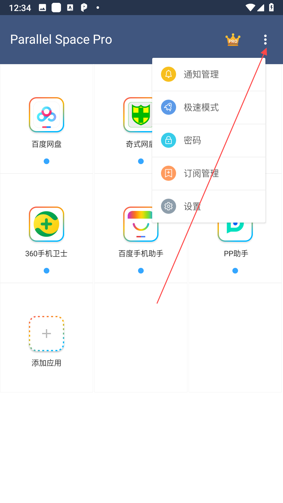 1、進(jìn)入平行空間主界面,在該界面中可以看到已添加的應(yīng)用程序列表,點(diǎn)擊界面右上角的三點(diǎn)圖標(biāo),會彈出一個功能菜單。