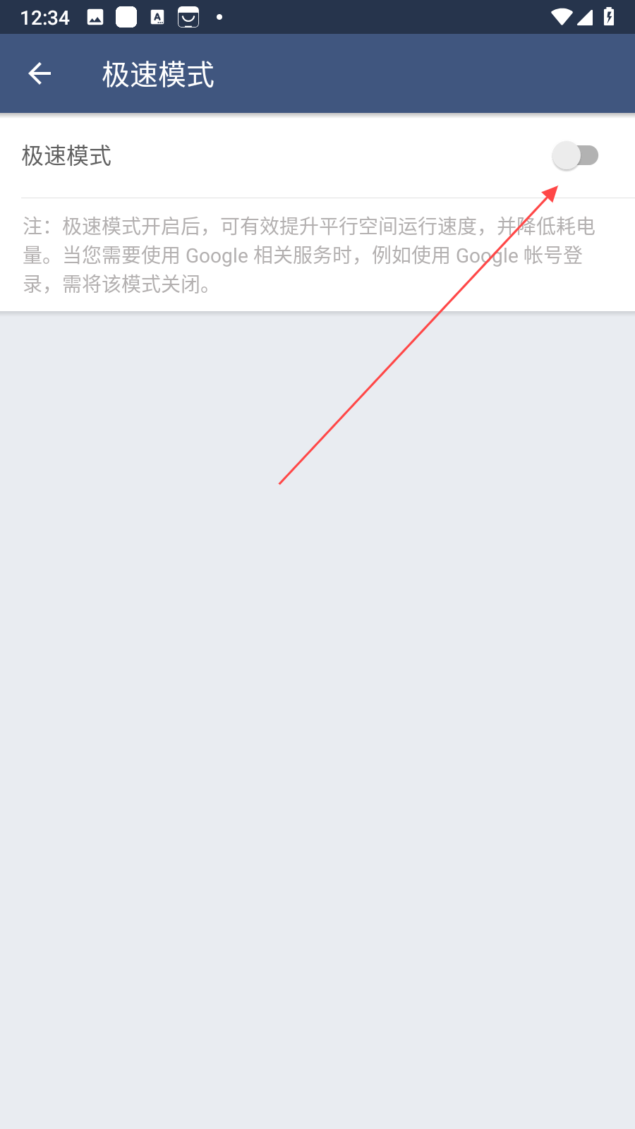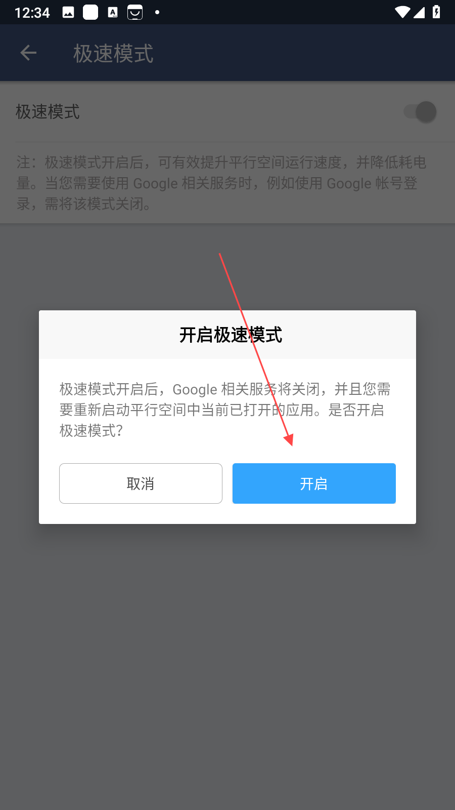 3、點(diǎn)擊極速模式右側(cè)的開關(guān)按鈕,此時會彈出一個確認(rèn)開啟極速模式的提示框,提示開啟極速模式后Google相關(guān)服務(wù)將關(guān)閉,且需要重新啟動平行空間中當(dāng)前已打開的應(yīng)用。