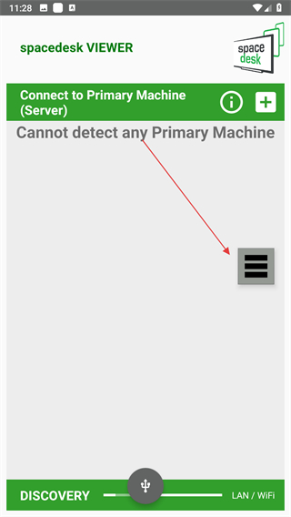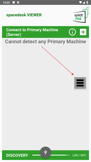 1、打開(kāi)spacedesk VIEWER應(yīng)用,點(diǎn)擊界面右側(cè)的菜單按鈕。