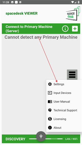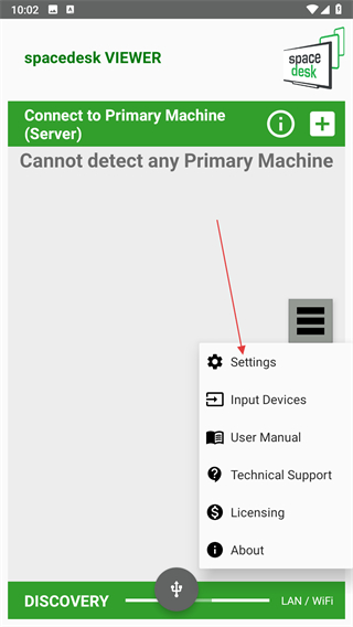 1、打開(kāi)spacedesk應(yīng)用,點(diǎn)擊三條橫線圖標(biāo),將會(huì)彈出菜單。