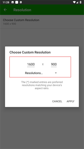 5、在彈出的窗口中選擇或自定義分辨率,點(diǎn)擊APPLY即可。