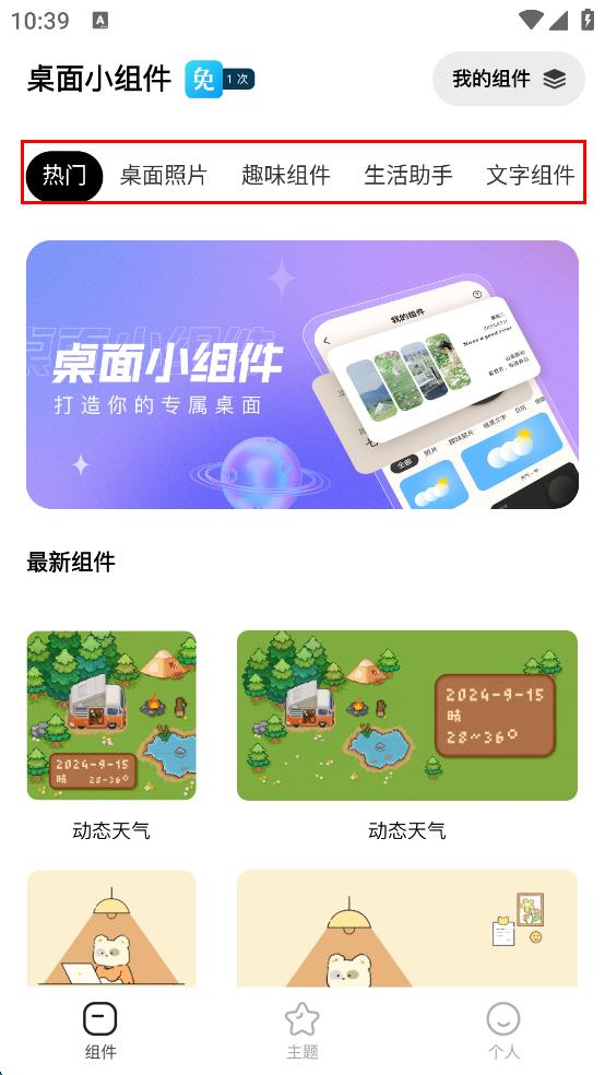 1、打開桌面小組件軟件,進(jìn)入后在頁面上方的分類欄中,找到感興趣的分類,點擊該分類,查看該分類下的組件。