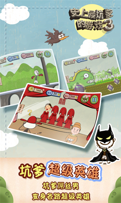 史上最坑爹的游戲3游戲是一款卡通風(fēng)格的休閑益智游戲,游戲?qū)焊阍睾透阈υ亟Y(jié)合起來,每一關(guān)的通關(guān)方式往往都出乎玩家的意料之外,游戲腦洞非常大,這也使得玩家要通關(guān)的話也需要非常大的腦洞,這個(gè)系列的游戲好評如潮,這第三部也延續(xù)了前兩部的傳統(tǒng),非常的惡搞。
