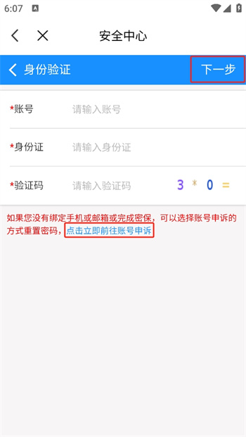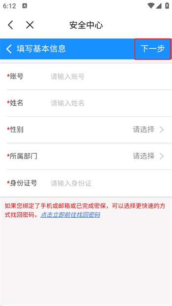 4、在這里你需要填寫自己的基本信息,才可以成功的完成自己的密碼找回申訴,再次點擊【下一步】進入下一步的操作界面中;