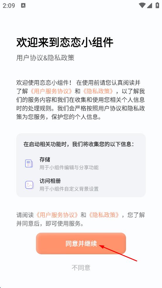 1、打開戀戀小組件,彈出用戶協(xié)議及隱私政策頁面,點(diǎn)擊“同意并繼續(xù)”按鈕,進(jìn)入軟件主界面。