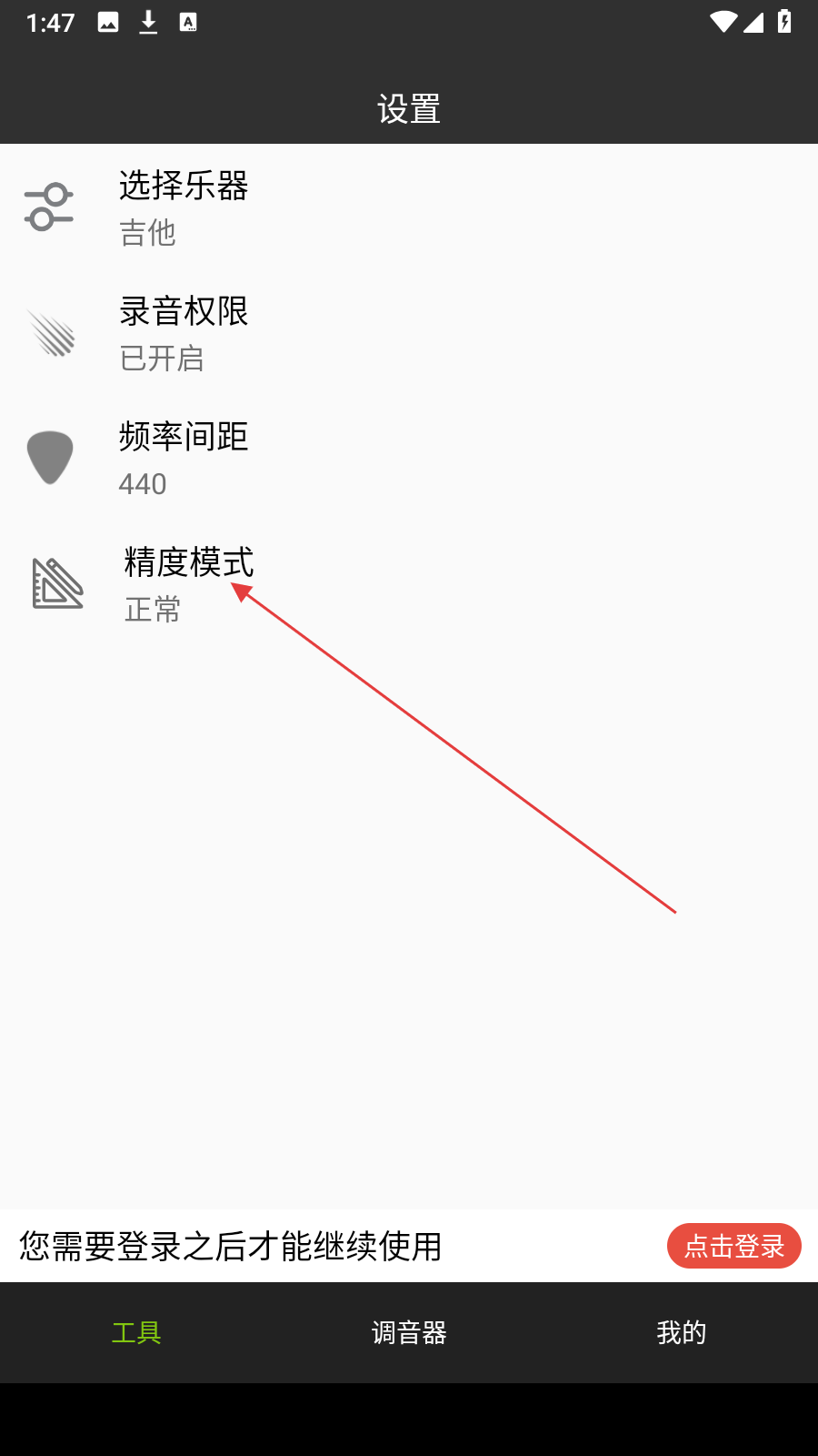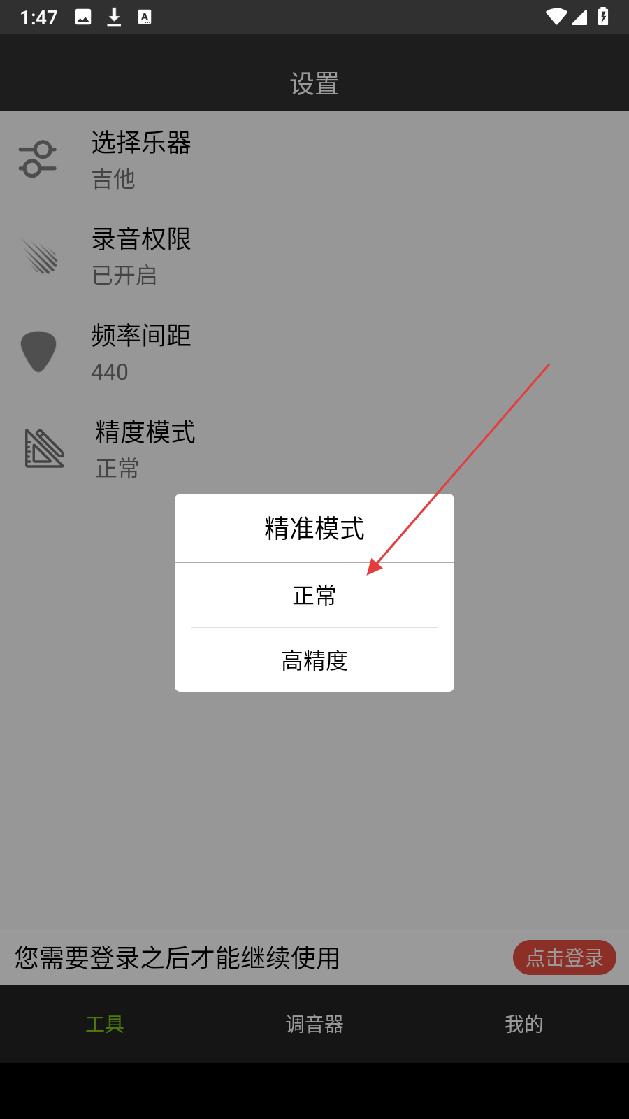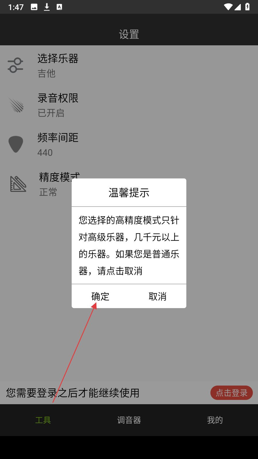 3、若選擇高精度模式,會彈出溫馨提示,告知該模式適用于高級樂器,確認自己的樂器適用后點擊確定。