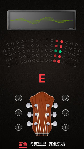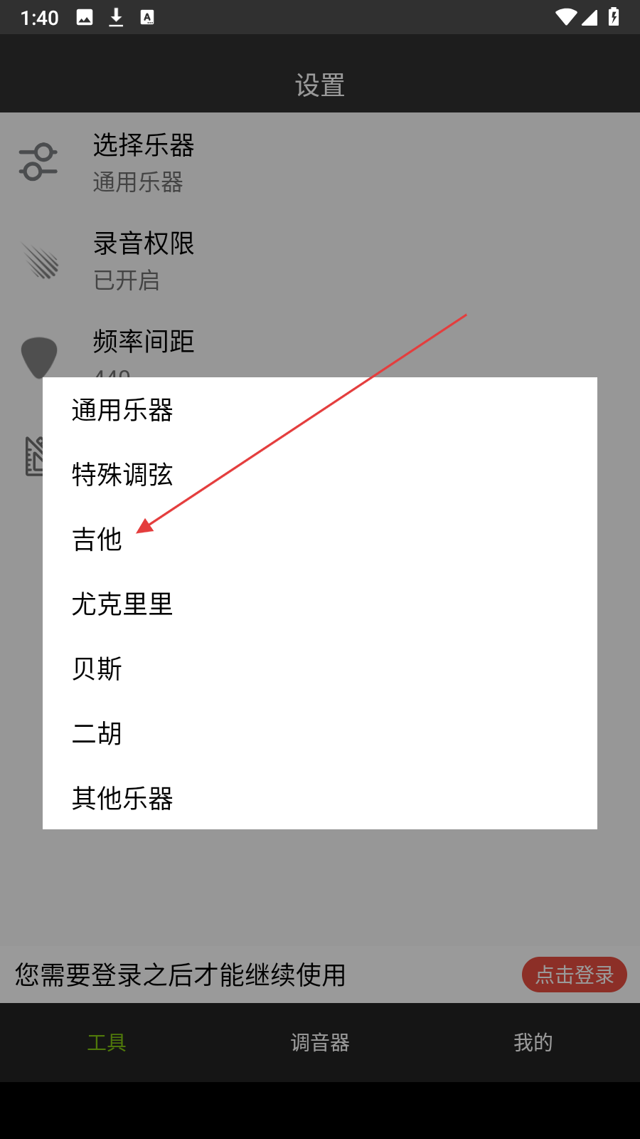 2、點(diǎn)擊界面中的選擇樂器選項(xiàng)之后,在彈出的樂器列表中點(diǎn)擊吉他,將調(diào)音器設(shè)置為吉他調(diào)音模式。