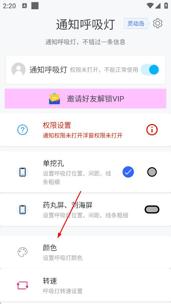 1、打開通知呼吸燈軟件,進入主界面后,在設(shè)置選項中找到“顏色”設(shè)置項,點擊該設(shè)置項,進入顏色設(shè)置頁面。