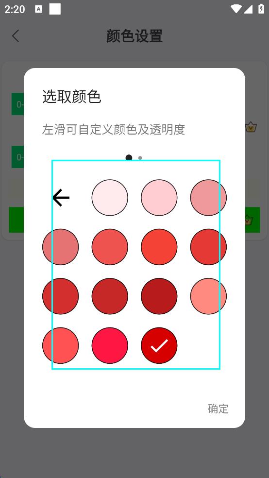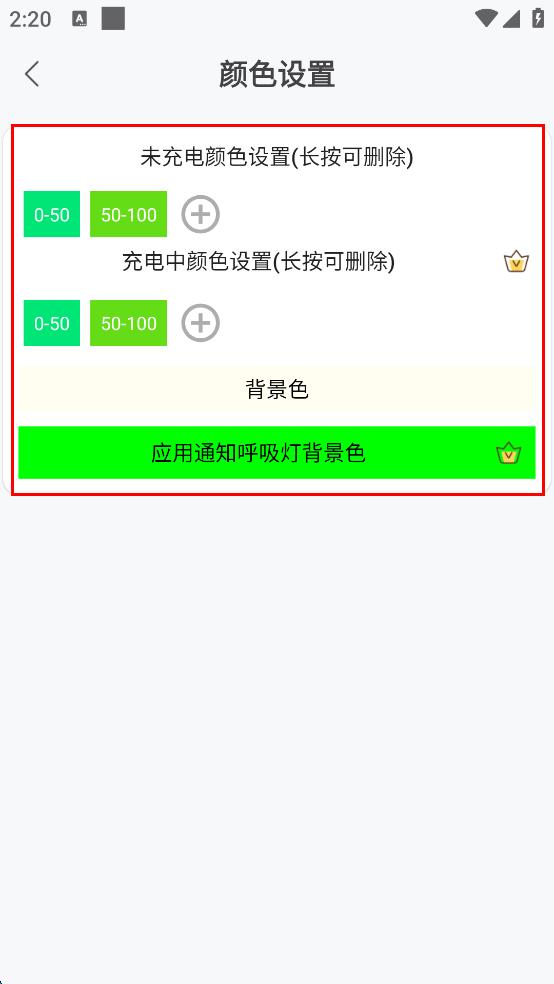 2、在顏色設(shè)置頁面,分別對未充電顏色設(shè)置和充電中顏色設(shè)置進行操作,點擊對應的顏色區(qū)間,彈出選取顏色的面板。