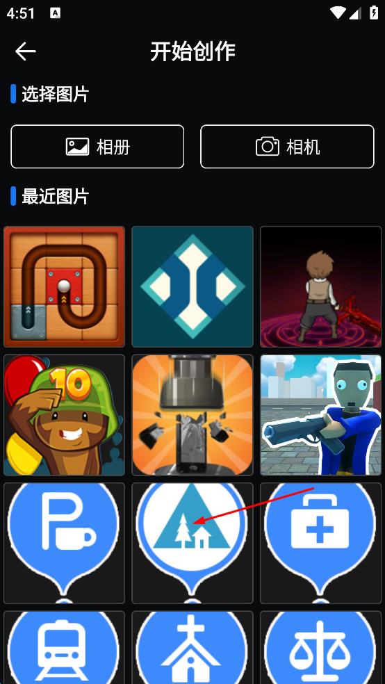 2、在開(kāi)始創(chuàng)作頁(yè),瀏覽最近圖片列表,選中目標(biāo)圖片如帶有山林房屋圖案的圖標(biāo),進(jìn)入裁剪環(huán)節(jié)。