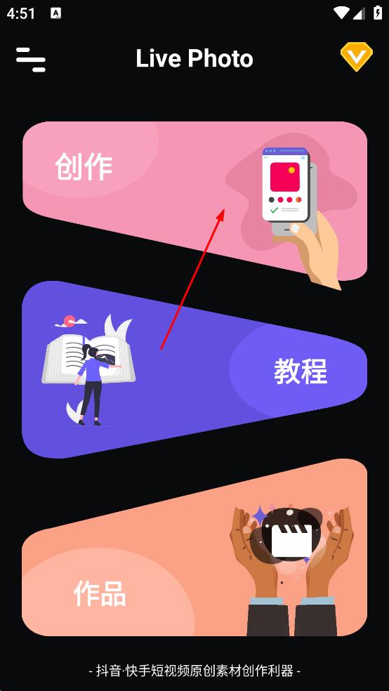 1、打開(kāi)Live Photo應(yīng)用,點(diǎn)擊創(chuàng)作選項(xiàng),進(jìn)入開(kāi)始創(chuàng)作頁(yè)面,可選擇從相冊(cè)或相機(jī)導(dǎo)入圖片素材。