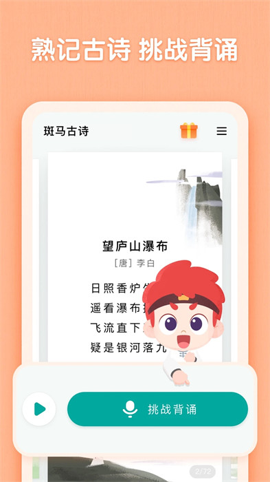 斑馬古詩app是一款專門給小朋友學習故事的軟件,其中包含了海量的背誦功能,都可以高效的幫助用戶解決背誦和學習古詩的問題,并且還有非常詳細的圖片以及含義來輔助用戶快速學習古詩,增加對于古詩的記憶力,有效提高背誦效率。