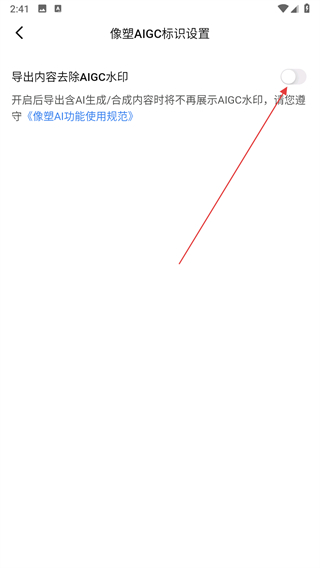 4、點(diǎn)擊導(dǎo)出內(nèi)容去除AIGC水印的開關(guān)按鈕。