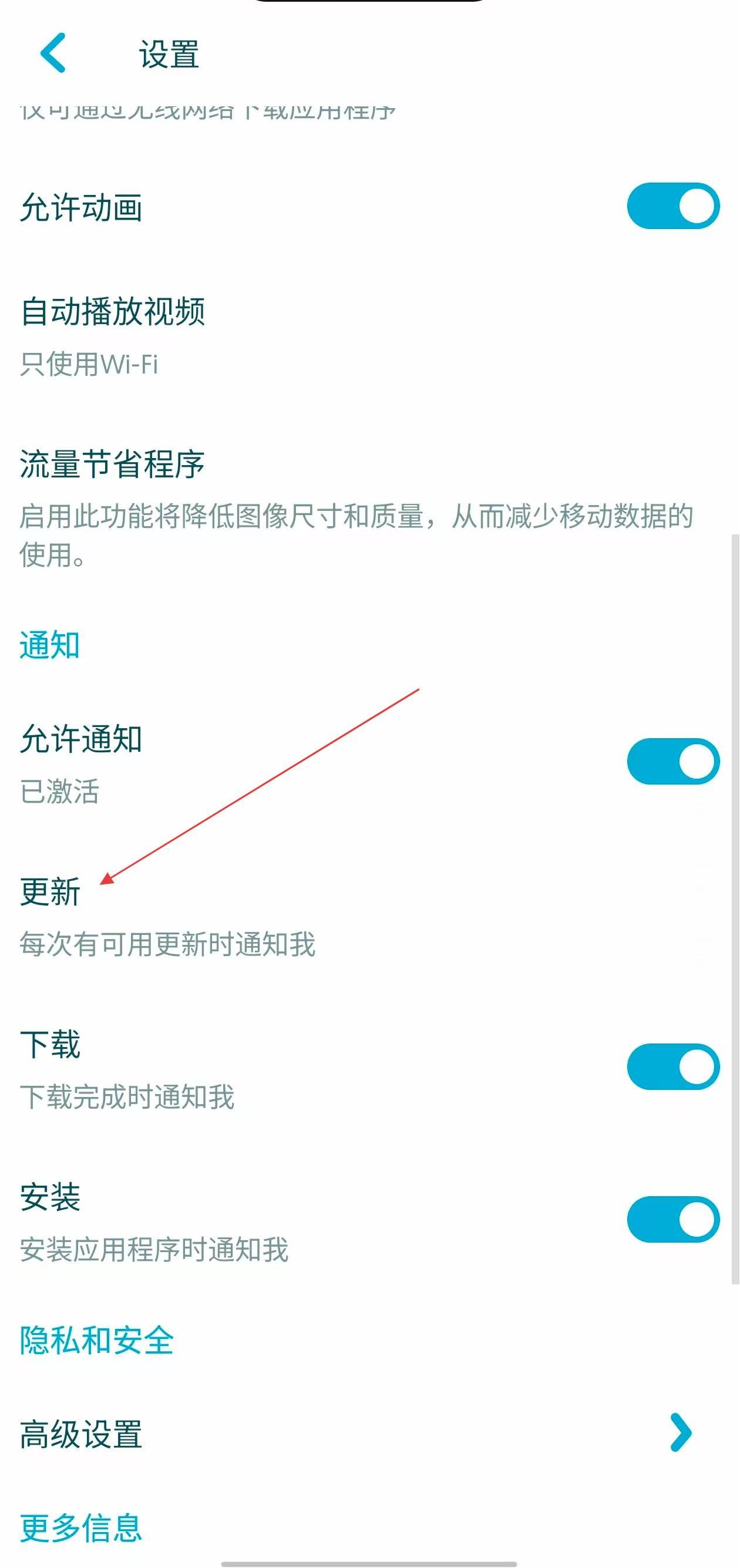 3、在設(shè)置界面里,點擊更新選項,彈出更新設(shè)置窗口。