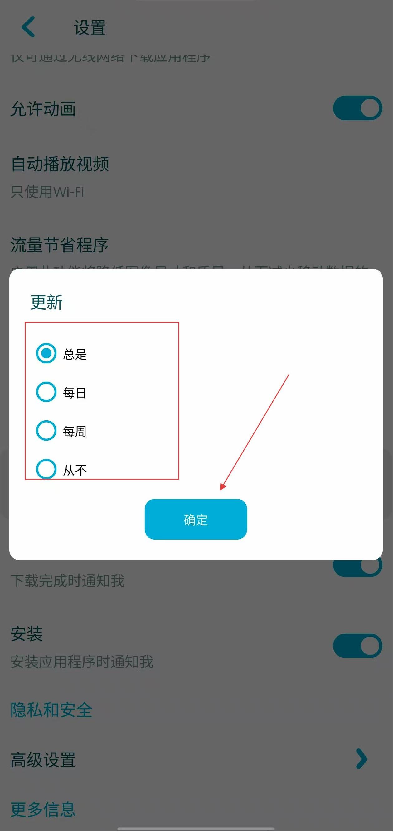 4、在更新設(shè)置窗口中,選擇合適的更新頻率,然后點擊確定按鈕,完成更新設(shè)置。