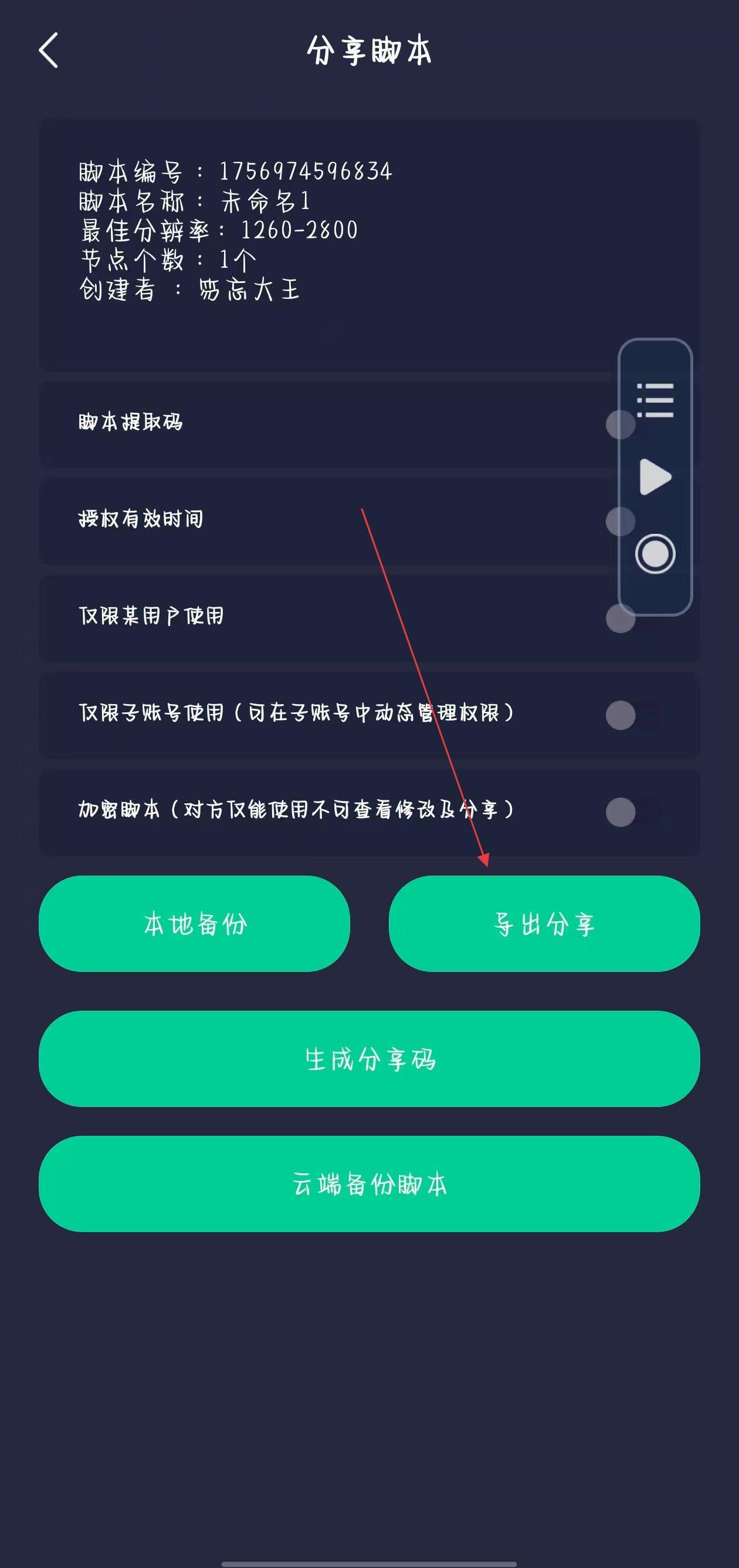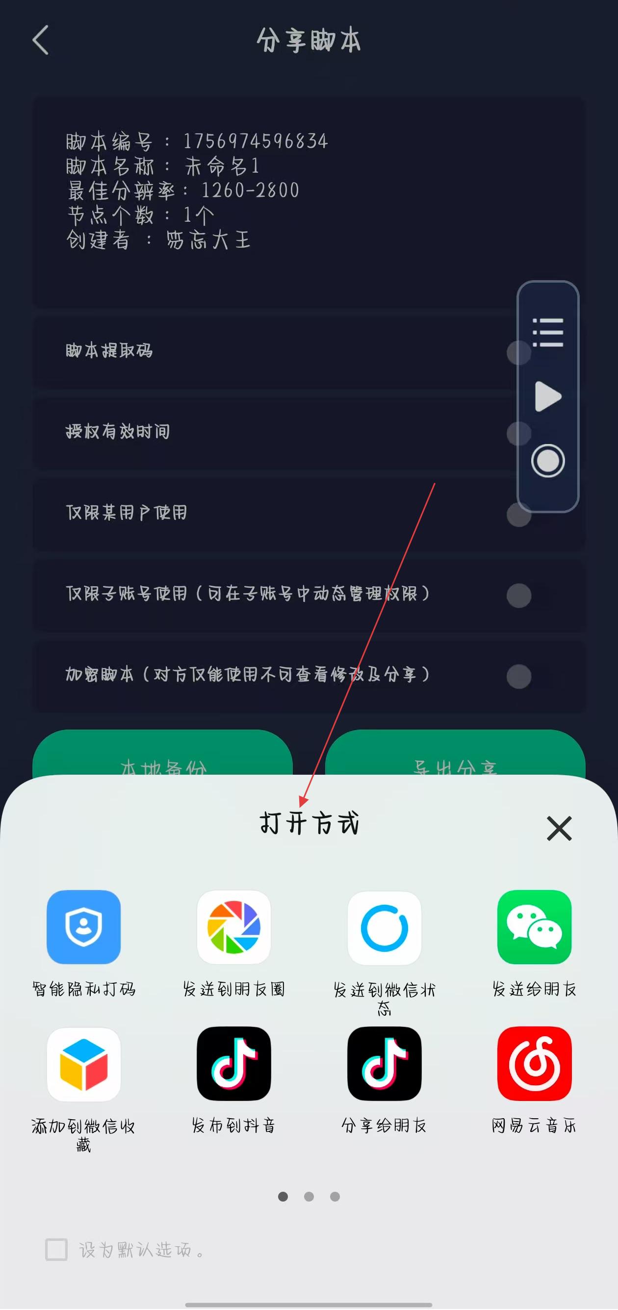 2、在分享腳本頁面中,可選擇導出分享,生成分享碼或云端備份腳本等方式,若選擇導出分享,點擊該按鈕后會彈出打開方式選擇框。