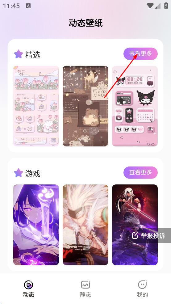 1、打開動態(tài)壁紙軟件,進入主界面后,在“精選”分類右側(cè),點擊“查看更多”按鈕,進入“精選”動態(tài)壁紙的完整展示頁面。