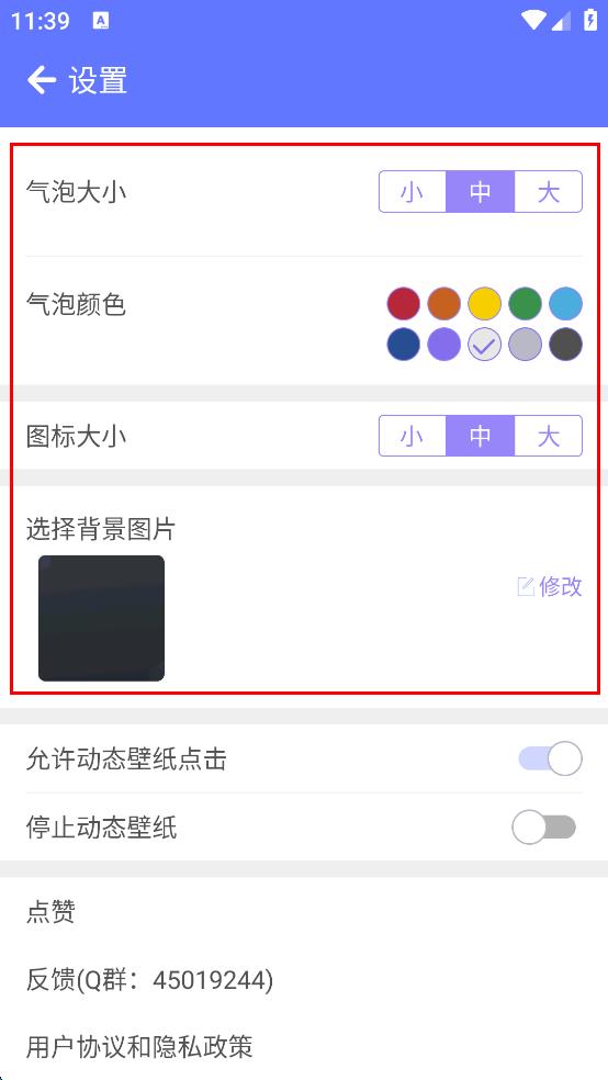 3、在設(shè)置頁(yè)面,對(duì)氣泡大小、氣泡顏色、圖標(biāo)大小以及背景圖片等進(jìn)行設(shè)置,調(diào)整到自己滿意的效果。