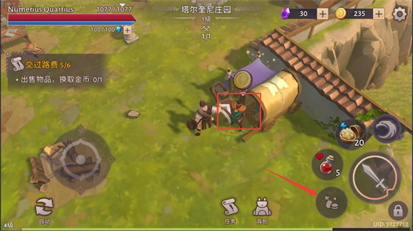 1、通過新手教程后,第一個任務就是【交過路費】,俗話說的好,一分錢難倒英雄漢,我們要找商人完成任務,靠近跟他溝通;